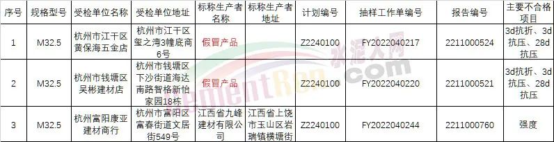 杭州市江干區(qū)黃保海五金店和杭州市錢塘區(qū)吳彬建材店抽檢到兩批次M32.5水泥為假冒產(chǎn)品,主要不合格項(xiàng)目為3d抗折、3d抗壓、28d抗壓;杭州富陽康亞建材商行M32.5水泥,標(biāo)稱生產(chǎn)者為江西省九峰建材有限公司主要不合格項(xiàng)目為強(qiáng)度。