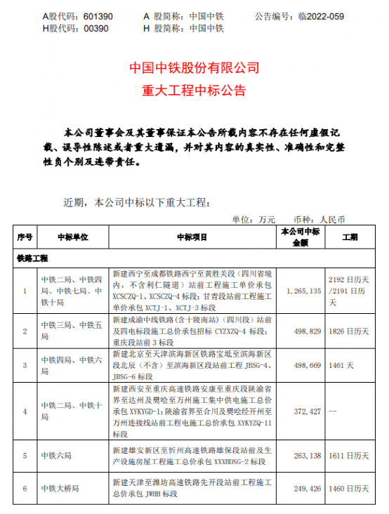 中國(guó)中鐵中標(biāo)價(jià)合計(jì)約人民幣589億元,約占公司2021年?duì)I業(yè)收入的5.51%。