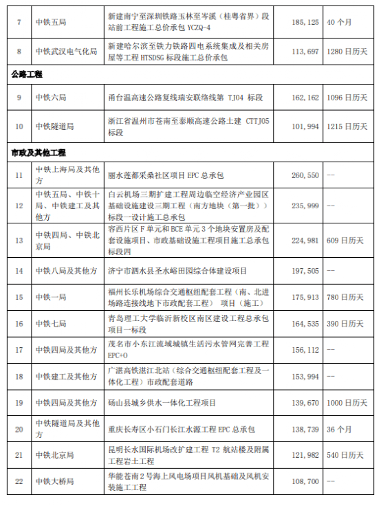 中國(guó)中鐵、中國(guó)鐵建中標(biāo)重大工程項(xiàng)目合計(jì)1261億元
