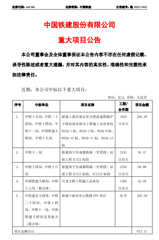 中國(guó)鐵建發(fā)布重大項(xiàng)目公告稱,已中標(biāo)合計(jì)672億重大項(xiàng)目。