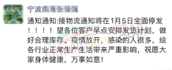 寧波一企業(yè)通知稱(chēng):接物流通知將在1月5日全面停發(fā)。望各位客戶早點(diǎn)安排發(fā)貨計(jì)劃,做好合理庫(kù)存。疫情放開(kāi),感染的人很多,給各行業(yè)正常生產(chǎn)、生活帶來(lái)嚴(yán)重影響。