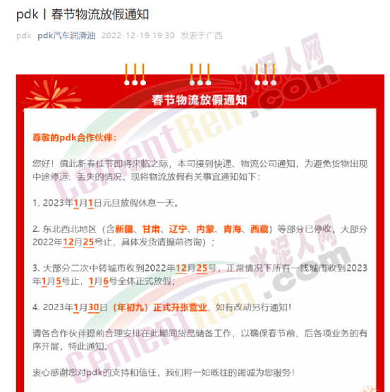pdk汽車(chē)潤(rùn)滑油春節(jié)物流放假通知稱(chēng),公司接到快遞、物流公司通知,為避免貨物出現(xiàn)中途停運(yùn)、丟失的情況,2023年1月1日元旦放假休息一天。