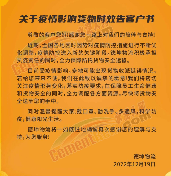 德坤物流關(guān)于疫情影響貨物時(shí)效告客戶書(shū)稱(chēng),近期,全國(guó)各地因時(shí)因勢(shì)對(duì)疫情防控措施進(jìn)行不斷優(yōu)化調(diào)整,疫情防控進(jìn)入新的關(guān)鍵階段,疫情影響,多地可能出現(xiàn)貨物收派延誤情況,德坤物流積極承擔(dān)抗疫責(zé)任的同時(shí),全力保障所托貨物安全運(yùn)輸。