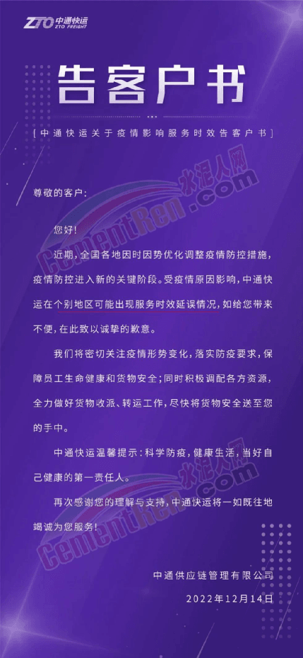 中通快運(yùn)關(guān)于疫情影響服務(wù)時(shí)效告客戶書(shū)稱(chēng):近期,全國(guó)各地因時(shí)因勢(shì)優(yōu)化調(diào)整疫情防控措施,疫情防控進(jìn)入新的關(guān)鍵階段。受疫情原因影響,中通快運(yùn)在個(gè)別地區(qū)可能出現(xiàn)服務(wù)時(shí)效延誤情況,如給您帶來(lái)不便,在此致以誠(chéng)摯的歉意。將密切關(guān)注疫情形勢(shì)變化,落實(shí)防疫要求,保障員工生命健康和貨物安全;同時(shí)積極調(diào)配各方資源,全力做好貨物收派、轉(zhuǎn)運(yùn)工作,盡快將貨物安全送至您的手中。