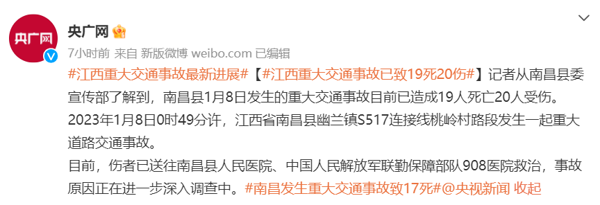 當(dāng)?shù)鼐用裉峁┑墓俜酵▓?bào)稱,2023年1月8日0時(shí)50分,在南昌縣幽蘭鎮(zhèn)桃?guī)X村紅溪章家自然村發(fā)生一起重大交通事故,一輛重型半掛牽引車(屬于樂(lè)平某物流公司),撞上出殯隊(duì)伍,初步掌握,事故已造成17人死亡、22人受傷,傷者已送往醫(yī)院搶救,車輛核載質(zhì)量32700KG,車輛裝載砂石。