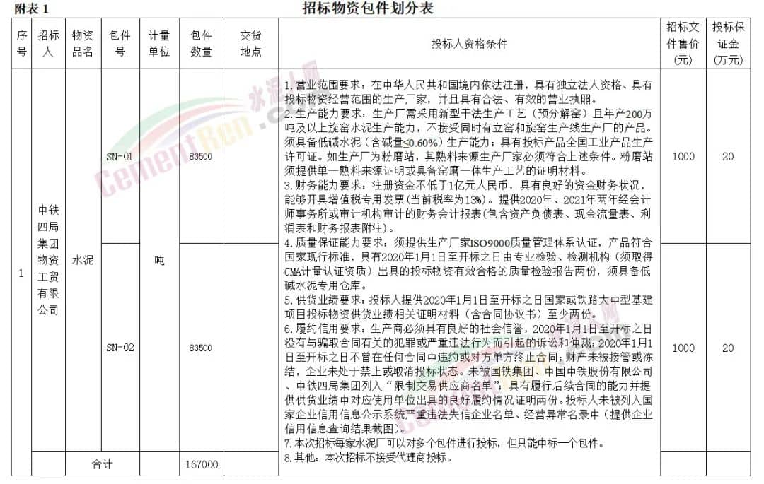 中鐵四局集團(tuán)有限公司深江鐵路五標(biāo)項(xiàng)目167000噸水泥采購(gòu)招標(biāo)公告中明確投標(biāo)人生產(chǎn)能力要求生產(chǎn)廠需采用新型干法生產(chǎn)工藝(預(yù)分解窯)且年產(chǎn)200萬(wàn)噸及以上旋窯水泥生產(chǎn)能力,不接受同時(shí)有立窯和旋窯生產(chǎn)線生產(chǎn)廠的產(chǎn)品。須具備低堿水泥(含堿量≤0.60%)生產(chǎn)能力;具有投標(biāo)產(chǎn)品全國(guó)工業(yè)產(chǎn)品生產(chǎn)許可證。如生產(chǎn)廠為粉磨站,其熟料來(lái)源生產(chǎn)廠家必須符合上述條件。粉磨站須提供單一熟料來(lái)源證明或具備窯磨一體生產(chǎn)工藝的證明材料,企業(yè)須具備低堿水泥專用倉(cāng)庫(kù)。