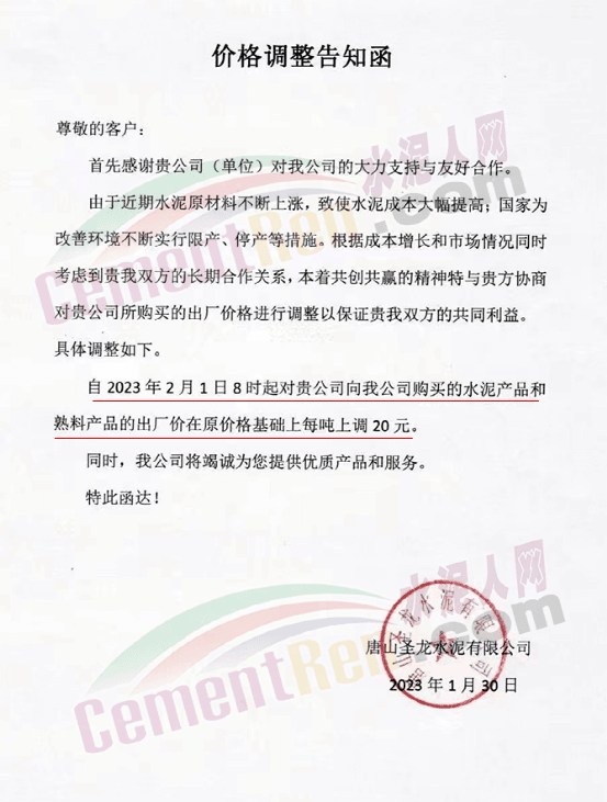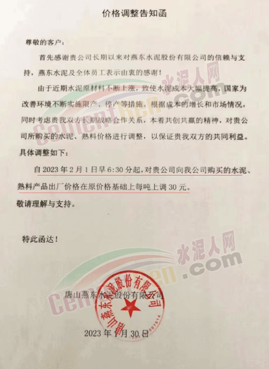 日前,唐山圣龍水泥有限公司、唐山燕東水泥股份有限公司、灤縣磐石水泥有限公司等水泥企業(yè)發(fā)布價(jià)格調(diào)整告知函稱,由于近期水泥、熟料原材料不斷上漲,致使水泥、熟料成本大幅提高;國家為改善環(huán)境不斷實(shí)行限產(chǎn)、停產(chǎn)等措施。根據(jù)成本增長和市場(chǎng)情況自2023年2月1日起對(duì)水泥、熟料產(chǎn)品的出廠價(jià)格上調(diào)20元/噸。