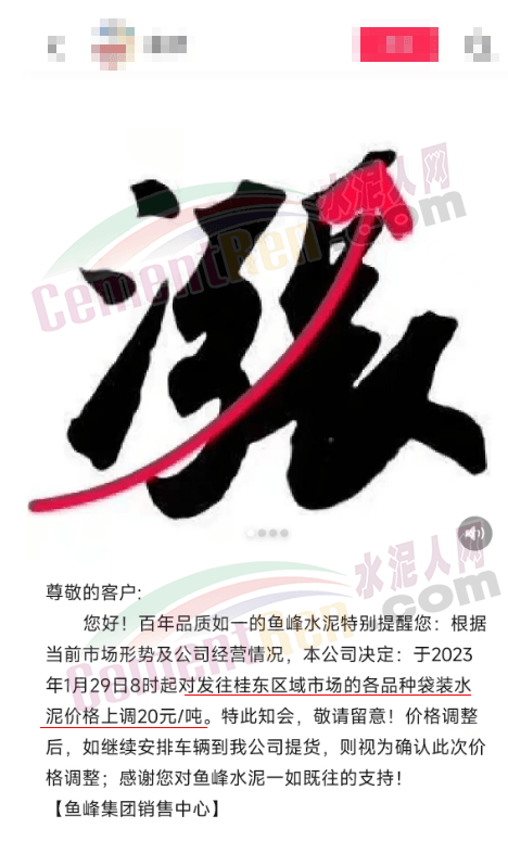 魚峰集團經(jīng)銷商轉(zhuǎn)發(fā)企業(yè)銷售中心對發(fā)往桂東區(qū)域市場的各品種袋裝水泥價格上調(diào)20元/噸的通知。