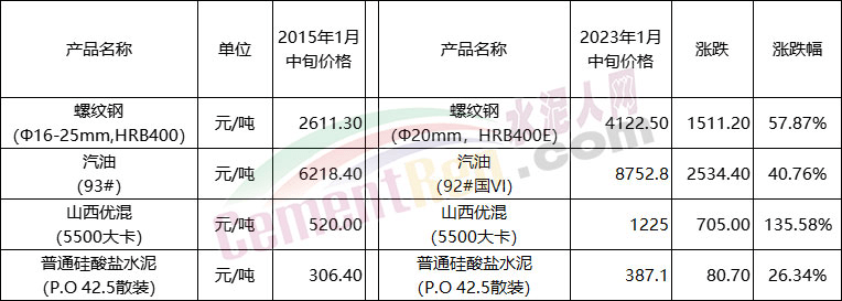 價格方面,國家統(tǒng)計局1月24日公布了2023年1月中旬流通領(lǐng)域重要生產(chǎn)資料市場價格變動情況。對比2015年相關(guān)數(shù)據(jù)可見,煤炭價格上漲了135.58%,螺紋鋼及汽油分別上漲了57.87%和40.76%,而P.O42.5散裝水泥價格僅上漲了26.34%。