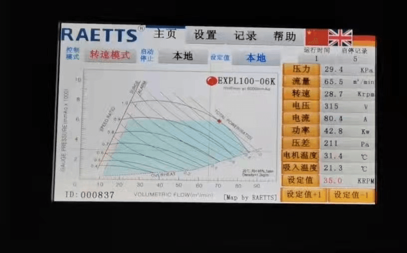 系統(tǒng)情況如下:風(fēng)量:55x1=55m³/min;壓力:68.6kPa;電機功率:105x1=105kW(實際運行功率105kW);比功率:105:55=1.91kW(m³/min)。