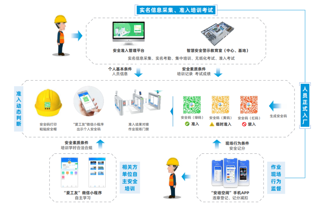 水泥企業(yè)相關(guān)方人員安全準(zhǔn)入管理,以相關(guān)方人員“個(gè)人基本條件+安全素質(zhì)條件+現(xiàn)場(chǎng)行為條件”為依據(jù),綜合研判人員準(zhǔn)入狀態(tài),生成安全碼,實(shí)現(xiàn)人因風(fēng)險(xiǎn)等級(jí)可視化。同時(shí),提供數(shù)據(jù)采集終端、安全培訓(xùn)終端、手機(jī)APP等應(yīng)用工具,用于人員信息采集、準(zhǔn)入培訓(xùn)考核、作業(yè)行為監(jiān)督,實(shí)現(xiàn)系統(tǒng)化準(zhǔn)入管理,嚴(yán)控人因風(fēng)險(xiǎn)。