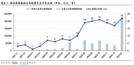 根據(jù)上海票交所2月10日公布名單,1月共1554家主體出現(xiàn)承兌人逾期現(xiàn)象,其中發(fā)債城投22家,較12月增加5家。主體類型方面,18家為新增主體,4家為存量主體;逾期規(guī)模方面,當(dāng)月城投票據(jù)逾期發(fā)生額累計(jì)約22.5億元,環(huán)比大幅增加19.0億元,其中新增主體累計(jì)逾期發(fā)生額16.7億元,存量主體新增逾期發(fā)生額5.8億元。