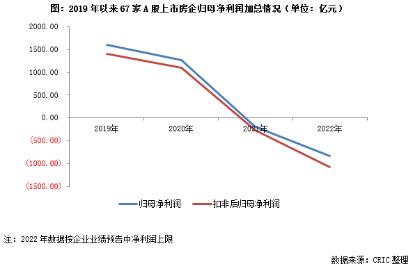 按上述67家房企預(yù)計(jì)的凈利潤上限計(jì)算的話,這些企業(yè)的歸母凈利潤總虧損839億元,扣非歸母凈利潤總虧損1073億元(下限1439億元),虧損規(guī)模同比大幅增加。