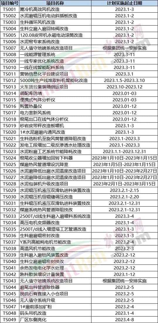 安全類項(xiàng)目涉及變頻器升級(jí)、皮帶廊加固、頭尾煤轉(zhuǎn)子秤控制系統(tǒng)、變頻器水冷系統(tǒng)、安全監(jiān)控網(wǎng)絡(luò)系統(tǒng)、高溫風(fēng)機(jī)改造、火災(zāi)檢測(cè)與自動(dòng)報(bào)警裝置、窯尾收塵器技改、煤粉制備防爆系統(tǒng)、原煤輸送系統(tǒng)及煤粉制備系統(tǒng)防爆電機(jī)改造、篦冷機(jī)推雪人裝置、生產(chǎn)線皮帶機(jī)、提升機(jī)VCS開關(guān)改造、水泥庫(kù)底增加清堵破碎裝置、石灰石礦山采用一卡通無人值守稱重過磅系統(tǒng)、石灰石礦山邊坡噴錨防護(hù)混噴植草項(xiàng)目、能量隔離系統(tǒng)技改項(xiàng)目、生料配料庫(kù)技改項(xiàng)目、淘汰落后變壓器更換技改項(xiàng)目、全廠大、中型收塵器加固改造項(xiàng)目、中控室DCS系統(tǒng)升級(jí)改造項(xiàng)目改造項(xiàng)目、混合材堆棚構(gòu)筑物安全隱患改造項(xiàng)目、水泥庫(kù)底增加清堵破碎裝置、高溫風(fēng)機(jī)、窯尾風(fēng)機(jī)增設(shè)旁路控制項(xiàng)目、石灰石礦山運(yùn)礦道路改道項(xiàng)目、總降后臺(tái)檢測(cè)保護(hù)系統(tǒng)改造、水泥庫(kù)疏堵技改項(xiàng)目以及礦山基建項(xiàng)目等。