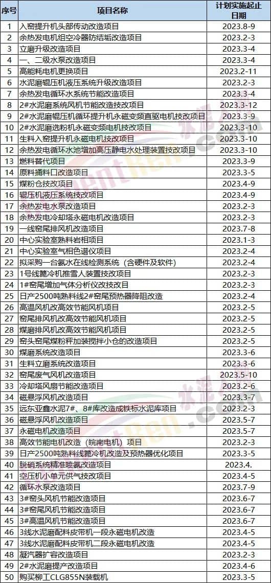 改善提升類項(xiàng)目包括,篦冷機(jī)高效風(fēng)機(jī)改造、生料循環(huán)風(fēng)機(jī)改造、生料立磨入磨回轉(zhuǎn)閥改造、皮帶機(jī)永磁電動(dòng)滾筒改造、水泥窯專家系統(tǒng)改造、無人值守地磅系統(tǒng)改造項(xiàng)目、水泥粉磨工藝系統(tǒng)節(jié)能降耗改造、窯尾收塵器增加回轉(zhuǎn)下料器、煤磨熱風(fēng)管道增設(shè)沉降室、水泥磨降低出磨水泥溫度改造項(xiàng)目、水泥包裝機(jī)升級(jí)改造項(xiàng)目、高壓電機(jī)變頻器改造、生料磨磨輥密封改造、磨尾出料管道除鐵器、脫硫石膏直接入小倉(cāng)項(xiàng)目、無人值守系統(tǒng)升級(jí)、磨前添加礦粉、碼頭吊機(jī)改造、廠區(qū)亮化工程等。