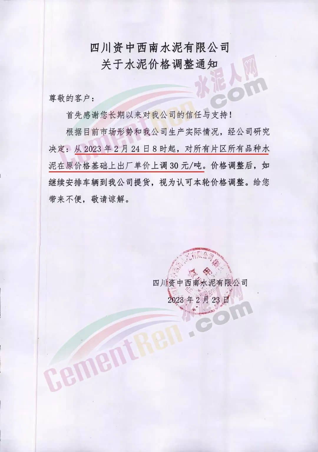 日前,四川資中西南水泥有限公司通知,根據(jù)目前形勢(shì)和公司生產(chǎn)實(shí)際情況,經(jīng)公司研究決定,從2月24日8時(shí)起,對(duì)所有片區(qū)所有品種水泥在原價(jià)格基礎(chǔ)上出廠單價(jià)上調(diào)30元/噸。