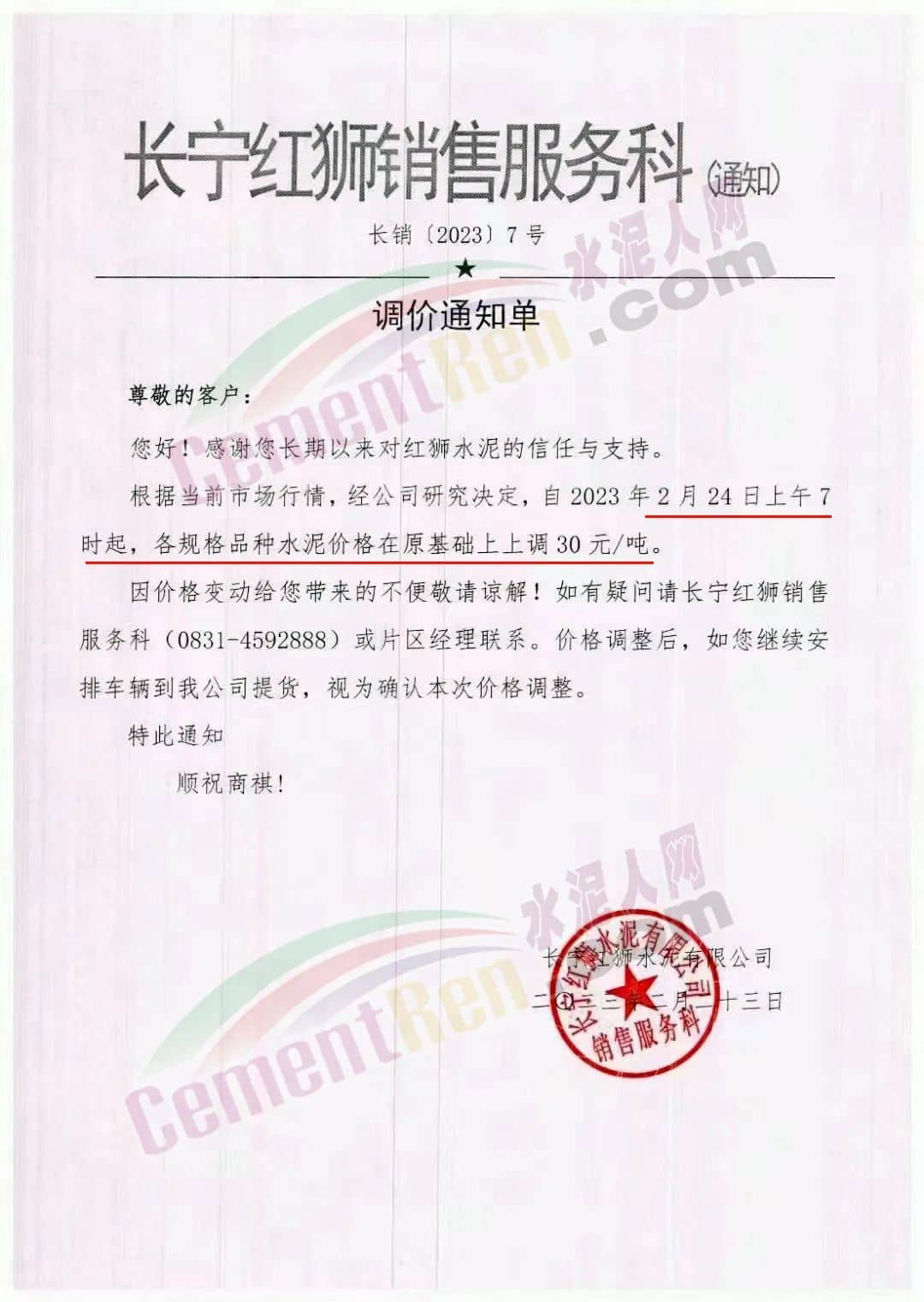 長(zhǎng)寧紅獅銷售服務(wù)科通知,根據(jù)當(dāng)前市場(chǎng)行情,經(jīng)公司研究決定,自2023年2月24日上午7時(shí)起,各規(guī)格品種水泥價(jià)格在原基礎(chǔ)上上調(diào)30元/噸。