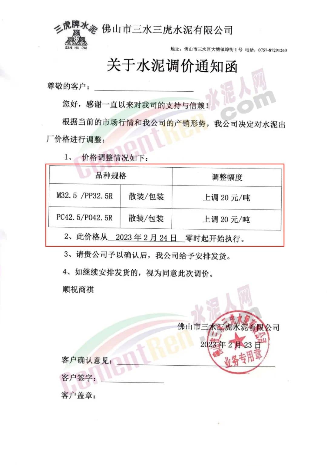 佛山市三水三虎水泥有限公司通知,自2月24日零時(shí)起,對(duì)各標(biāo)號(hào)水泥出廠價(jià)格上調(diào)20元/噸。