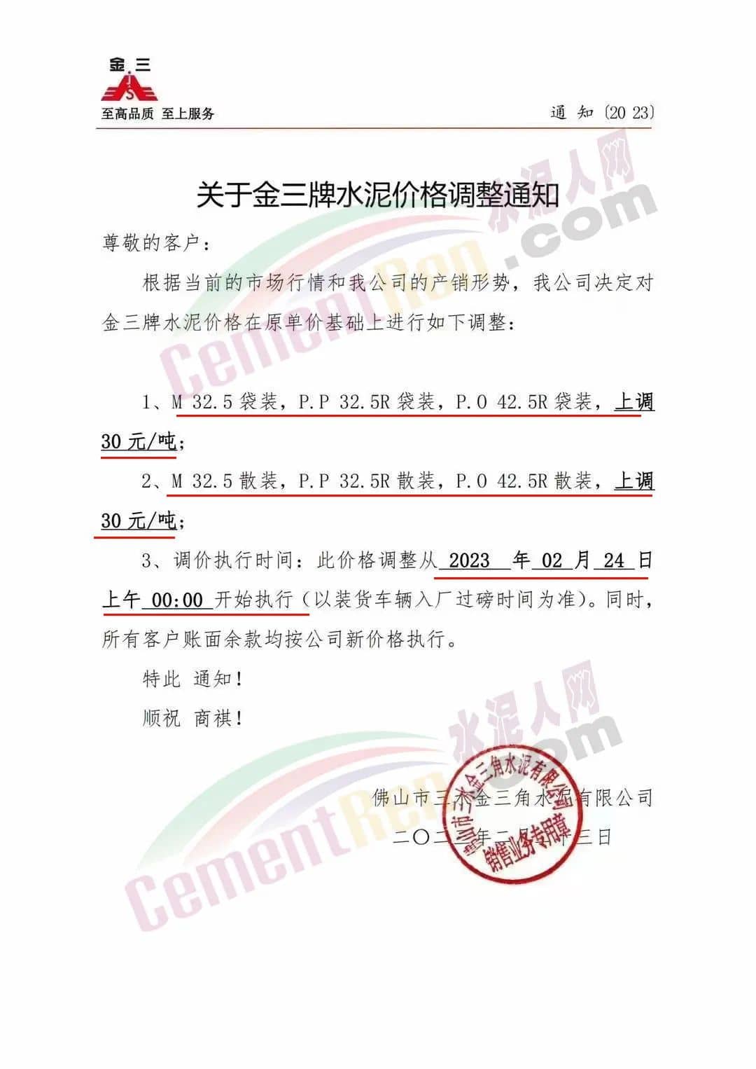 瀘州賽德水泥有聚公司通知從2023年2月24日8時(shí)開(kāi)始,所有區(qū)域所有品種上調(diào)30元/噸。