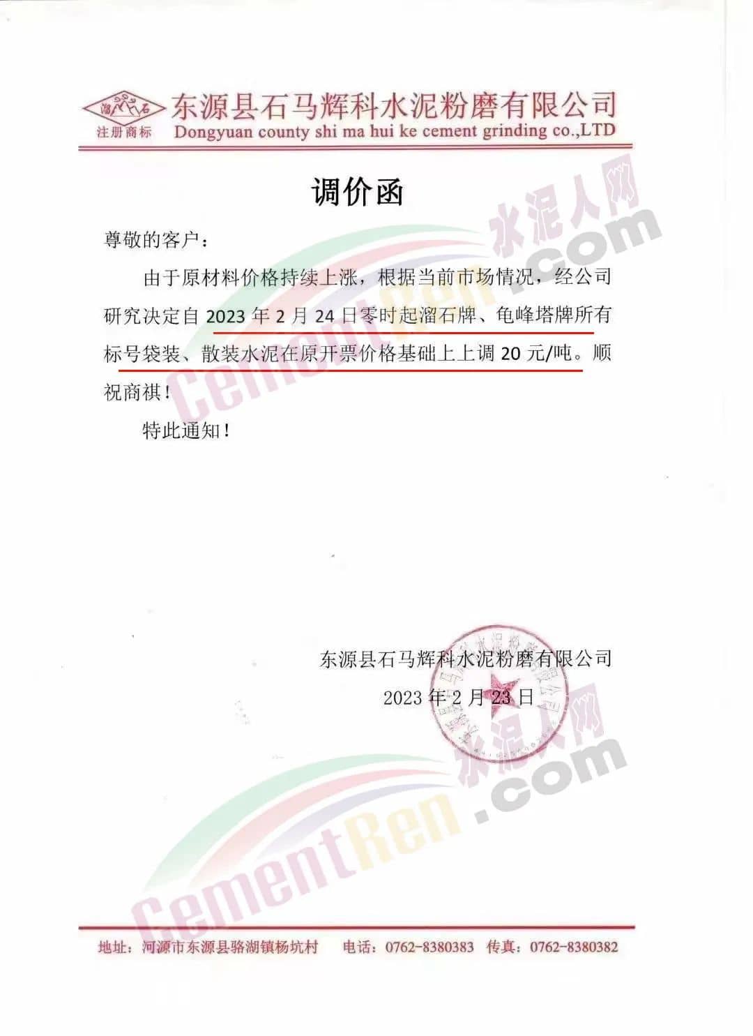 東源縣石馬輝科水泥粉磨有限公司通知,由于原材料價(jià)格持續(xù)上漲,根據(jù)當(dāng)前市場(chǎng)情況,經(jīng)公司研究決定自2023年2月24日零時(shí)起溜石牌、龜峰塔牌所有標(biāo)號(hào)袋裝、散裝水泥在原開(kāi)票價(jià)格基礎(chǔ)上上調(diào)20 元/噸。