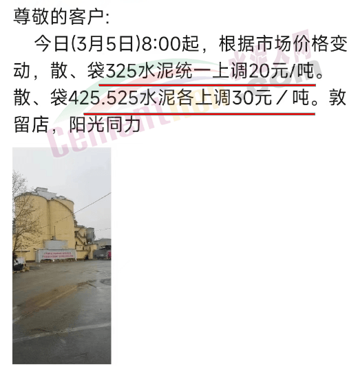 日前,河南區(qū)域陽光同力通知3月5日8時(shí)起,根據(jù)市場價(jià)格變動,散、袋32.5水泥統(tǒng)一上調(diào)20元/噸。散、袋42.5、52.5水泥各上調(diào)30元/噸。