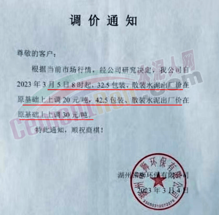湖州昂獅環(huán)保有限公司通知,根據(jù)當(dāng)前市場行情,經(jīng)公司研究決定,公司自2023年3月5日8時(shí)起,32.5包裝、散裝水泥出廠價(jià)在原基礎(chǔ)上上調(diào)20元/噸,42.5包裝、散裝水泥出廠價(jià)在原基礎(chǔ)上上調(diào)30元/噸。