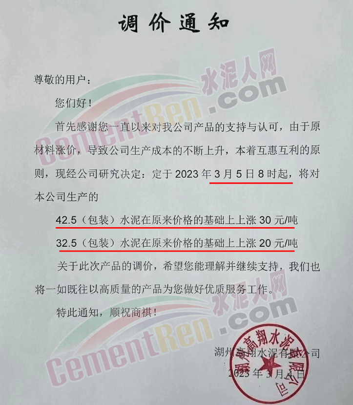 湖州高翔水泥有限公司通知,由于原材料漲價(jià),導(dǎo)致公司生產(chǎn)成本的不斷上升,本著互惠互利的原則,現(xiàn)經(jīng)公司研究決定,于2023年3月5日8時(shí)起,將對本公司生產(chǎn)的42.5(包裝)水泥在原來價(jià)格的基礎(chǔ)上上漲 30元/噸,325(包裝)水泥在原來價(jià)格的基礎(chǔ)上上漲20元/噸。