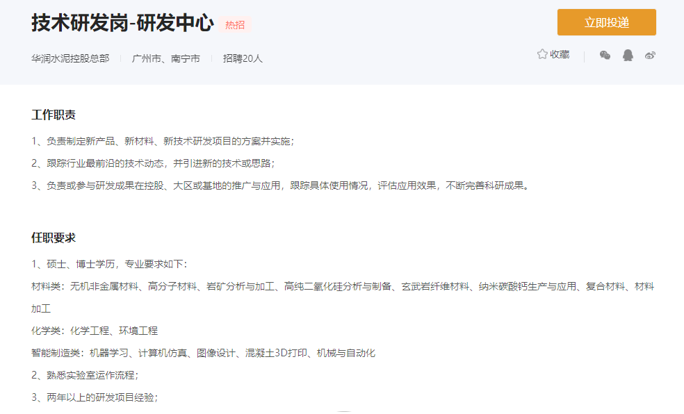 技術研發(fā)崗共招聘20人,任職要求碩士、博士學歷專業(yè)要求材料類:無機非金屬材料、高分子材料、巖礦分析與加工、高純二氧化硅分析與制備、玄武巖纖維材料、納米碳酸鈣生產(chǎn)與應用、復合材料、材料加工;化學類:化學工程、環(huán)境工程;智能制造類:機器學習、計算機仿真、圖像設計、混凝土3D打印、機械與自動化。并且要求熟悉實驗室運作流程和兩年以上的研發(fā)項目經(jīng)驗。