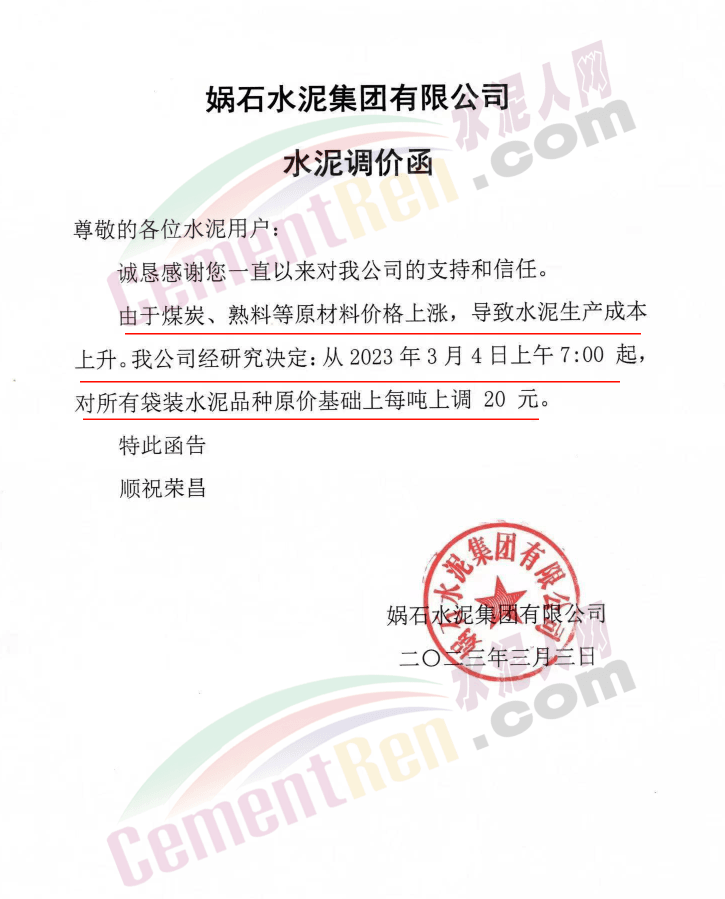 湖北媧石水泥集團有限公司通知,由于煤炭、熟料等原材料價格上漲,導致水泥生產(chǎn)成本上升,公司經(jīng)研究決定,從3月4日上午7時起,對所有袋裝水泥品種在原價基礎上上調(diào)20元/噸。