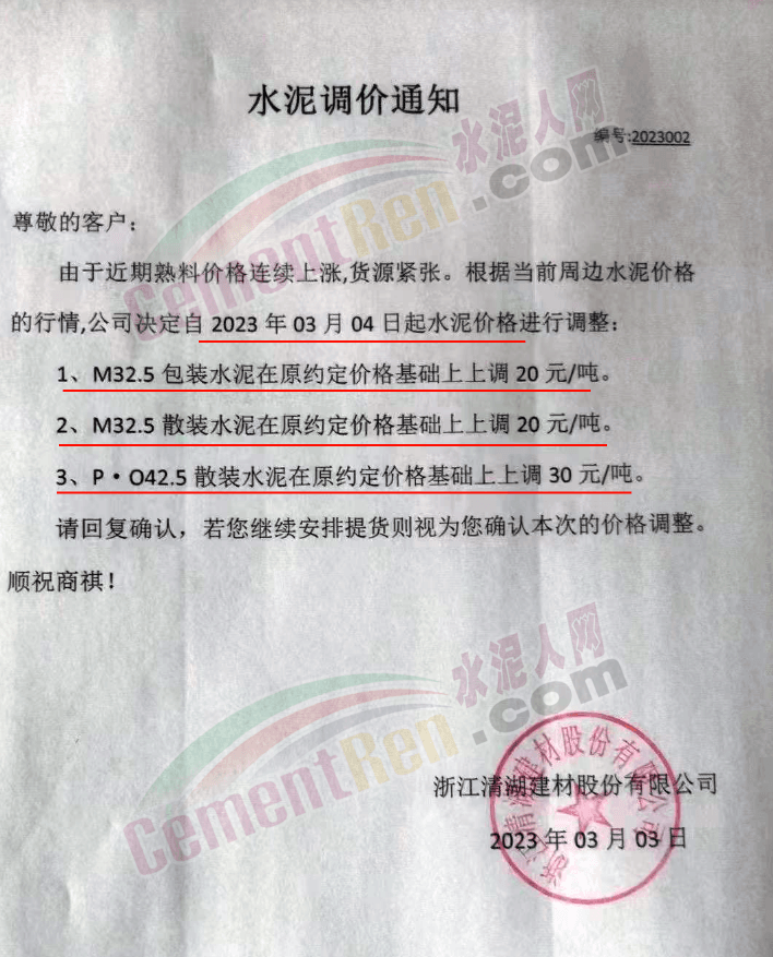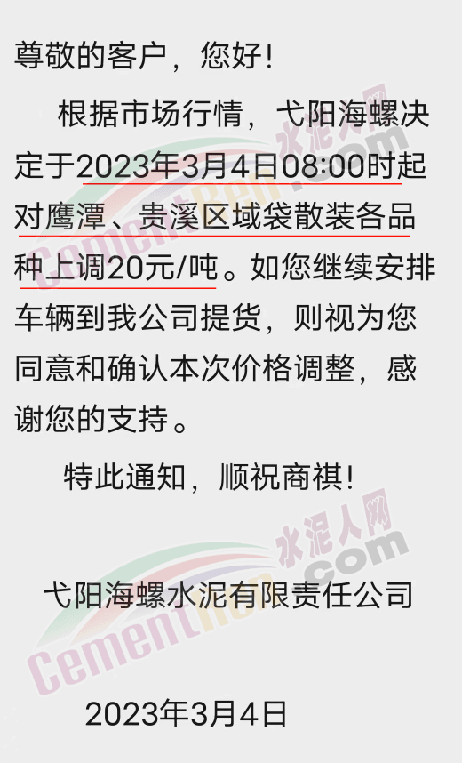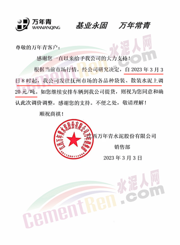 江西萬年青水泥股份有限公司通知,根據(jù)當前市場行情,經(jīng)公司研究決定,自2023年3月3日8時起,公司發(fā)往撫州市場的各品種袋裝、散裝水泥上調(diào)20元/噸。