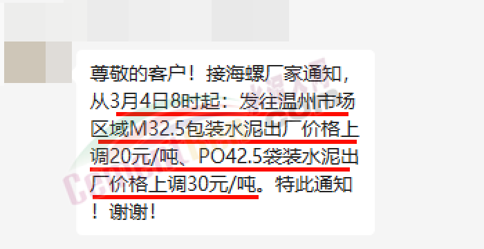 海螺經(jīng)銷商發(fā)消息稱,接海螺廠家通知,從3月4日8時起,發(fā)往溫州市場區(qū)域M32.5包裝水泥出廠價格上調(diào)20元/噸、P.O42.5袋裝水泥出廠價上調(diào)30元/噸。