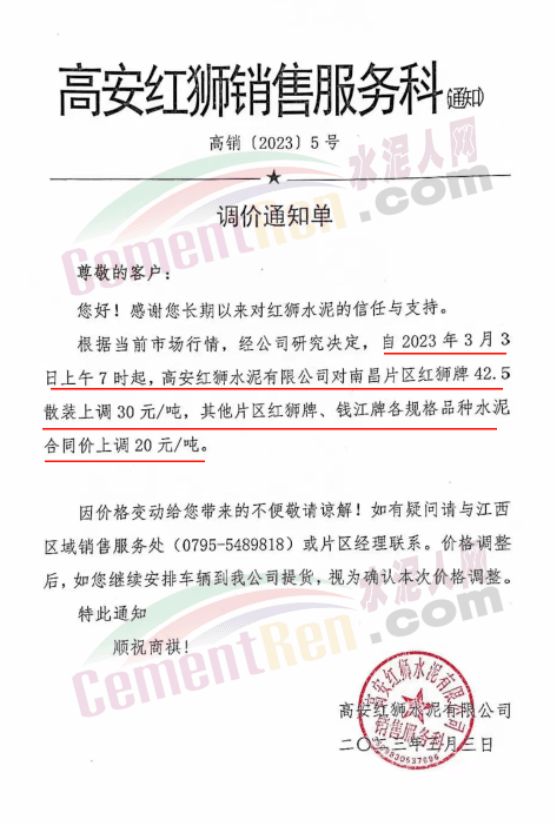 高安紅獅水泥銷售服務科通知,根據(jù)當前市場行情,經(jīng)公司研究決定,自2023年3月3日上午7時起,高安紅獅水泥有限公司對南昌片區(qū)紅獅牌42.5散裝上調(diào)30元/噸,其他片區(qū)紅獅牌、錢江牌各規(guī)格品種水泥合同價上調(diào)20元/噸。