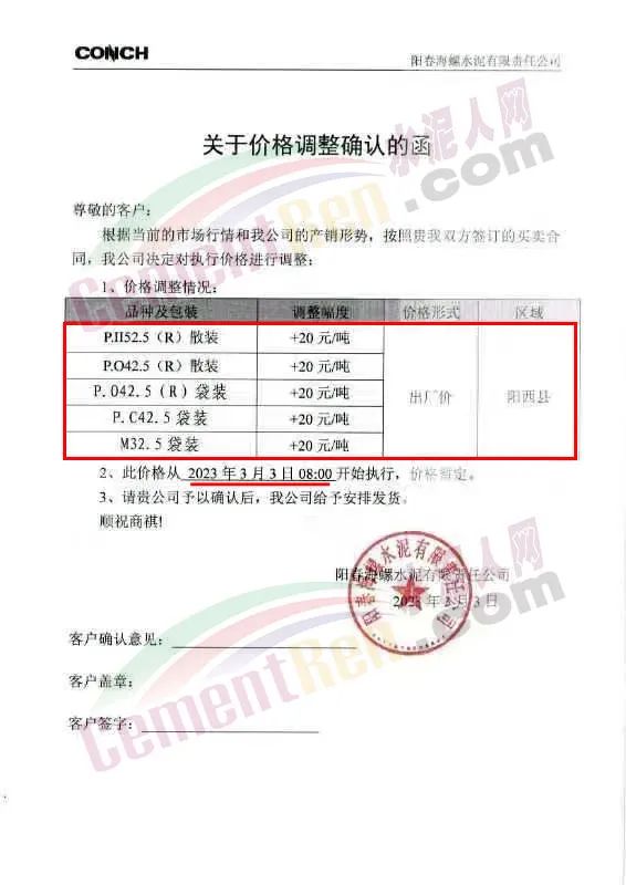 日前,陽春海螺水泥有限責任公司通知,從3月3日8時起各標號水泥陽西縣區(qū)域出廠價上調(diào)20元/噸。