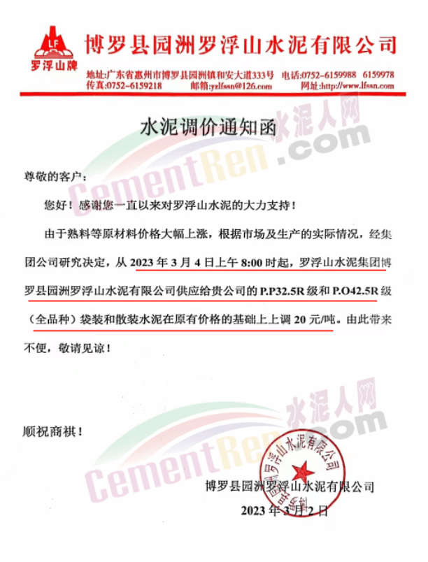 3月4日羅浮山水泥集團惠州市寶湖建材制造有限公司、博羅縣園洲羅浮山水泥有限公司PP32.5R級PP32.5級和P.O42.5R級(全品種)袋裝水泥和散裝水泥上調(diào)20元/噸。企業(yè)曾于2月23日發(fā)函上調(diào)上述標號水泥價格20元/噸。兩次累計上調(diào)40元/噸。