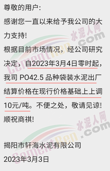 揭陽市軒海水泥有限公司通知,3月4日零時起,P.O42.5袋裝水泥出廠價上調(diào)10元/噸。