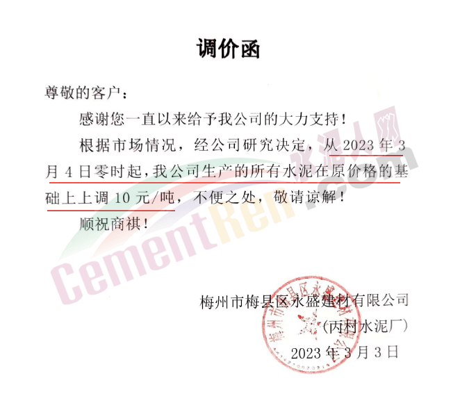 梅州市梅縣區(qū)永盛建材有限公司通知,3月4日零時起,公司生產(chǎn)的所有水泥在原價基礎上上調(diào)10元/噸。