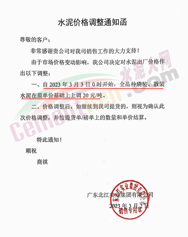 廣東北江實業(yè)集團有限公司通知,由于市場價格變動影響,公司決定自3月3日0時開始全品種水泥上調(diào)20元/噸。