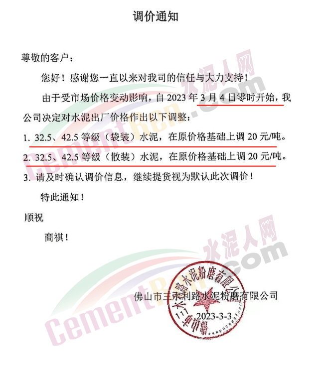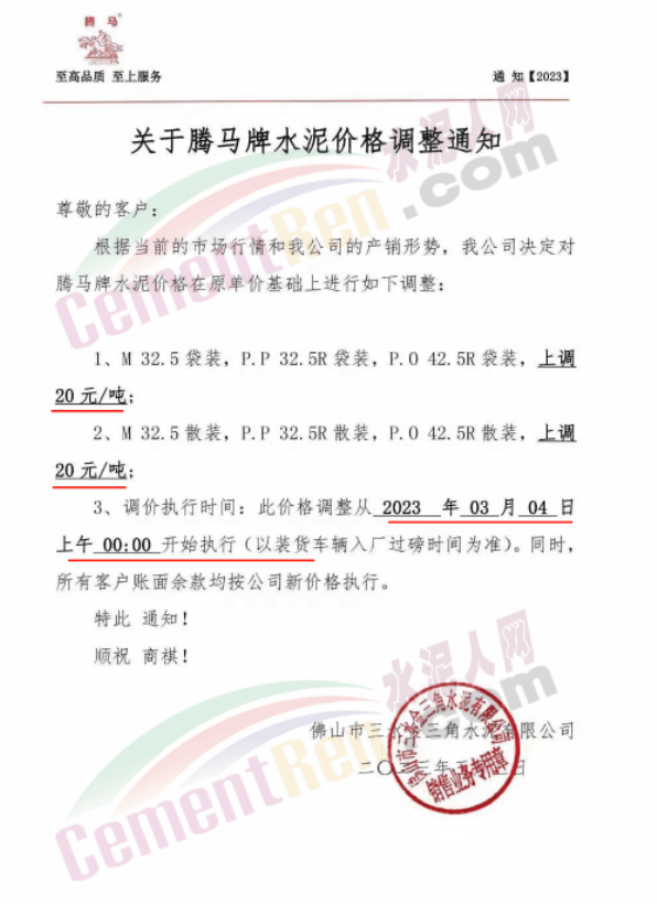 佛山市三水三虎水泥通知,3月4日零時起各標號水泥上調(diào)20元/噸。