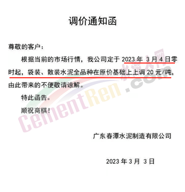 廣東春潭水泥制造有限公司通知,3月4日零時起,全品種水泥在原基礎上上調(diào)20元/噸。