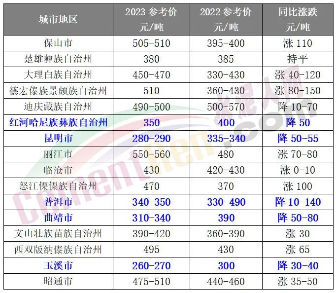 從水泥人網(wǎng)信息中心參考數(shù)據(jù)可見,云南多個城市地區(qū)目前報價較上年同期仍略有上漲,但是迪慶、紅河、昆明、普洱、曲靖、玉溪等區(qū)域水泥價格較上年同期報價均有不同的下降。其中昆明、玉溪區(qū)域水報價均不足300元/噸,普洱、曲靖市報價在350元/噸及以下。而這幾個區(qū)域正是近期連續(xù)發(fā)布調(diào)價通知的區(qū)域。即使是從全國市場來看,低價格洼地也是昆明、玉溪區(qū)域。