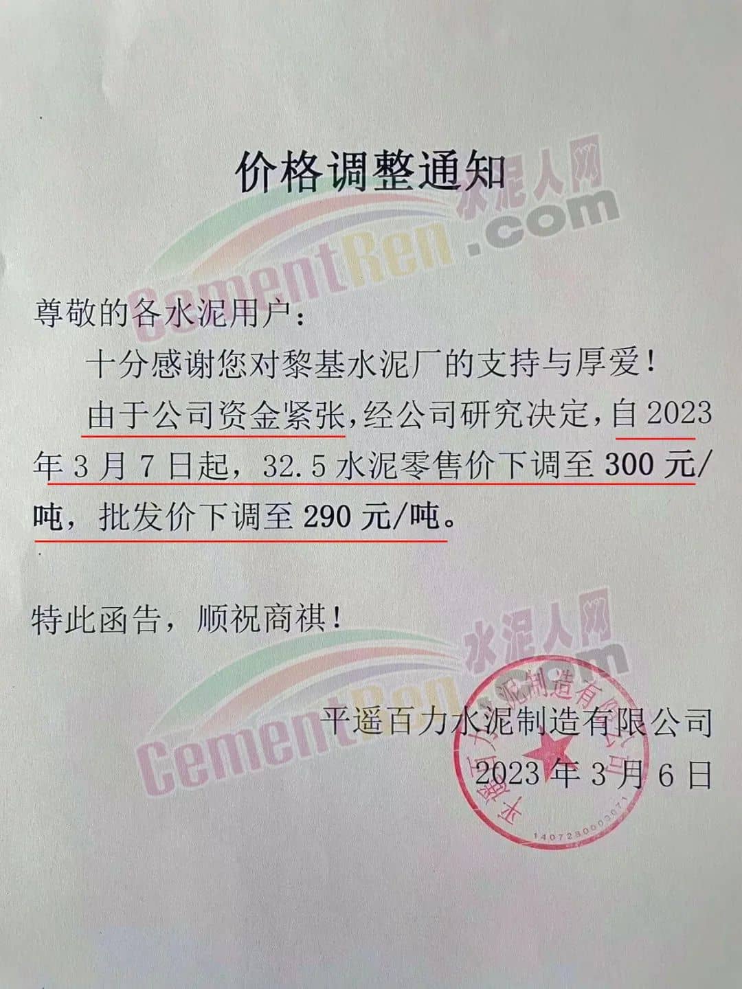 但是,平遙百力水泥制造有限公司卻發(fā)了張“降價(jià)函”。企業(yè)價(jià)格調(diào)整通知稱,由于公司資金緊張,自2023年3月7日起,32.5水泥零售價(jià)下調(diào)至300 元/噸,批發(fā)價(jià)下調(diào)至290元/噸。