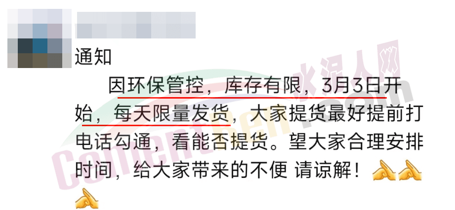另據(jù)水泥人網(wǎng)此前消息,山西長(zhǎng)治的一家水泥企業(yè)曾發(fā)出通知稱環(huán)保管控,庫(kù)存有限,即日起限量發(fā)貨,提貨需提前預(yù)約。