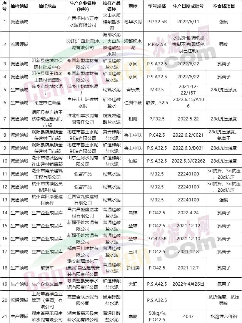 近來各省市地方市場監(jiān)管總局通報的水泥質(zhì)量不合格情況顯示, 抗壓、抗折強度及氯離子不合格仍為“重災(zāi)區(qū)”,且多出現(xiàn)在市場流通領(lǐng)域。