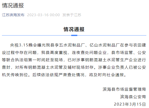 據(jù)“江蘇濱海發(fā)布”微信號16日0時消息,濱??h市場監(jiān)督管理局、濱海縣公安局通報稱,央視“3.15”晚會曝光濱??h李五水泥制品廠、億山水泥制品廠在參與農(nóng)田建設(shè)過程中存在問題,濱??h高度重視,連夜查處問題企業(yè),縣市場監(jiān)管、公安等聯(lián)合執(zhí)法組第一時間趕至現(xiàn)場,已對涉事鋼筋混凝土水泥管生產(chǎn)企業(yè)進(jìn)行查封,對所有鋼筋混凝土水泥管及輔材現(xiàn)場封存。涉事企業(yè)負(fù)責(zé)人已被公安機(jī)關(guān)傳喚到位。后續(xù)依法依規(guī)嚴(yán)肅查處情況,將及時向社會通報。
