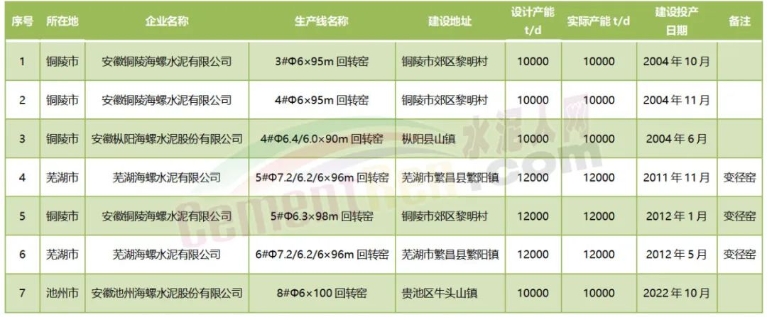 近來多個省市自治區(qū)公布截止2022年12月底的水泥熟料生產(chǎn)線清單,水泥人網(wǎng)注意到在安徽省公布的清單中,海螺水泥七條萬噸線尤其亮眼。