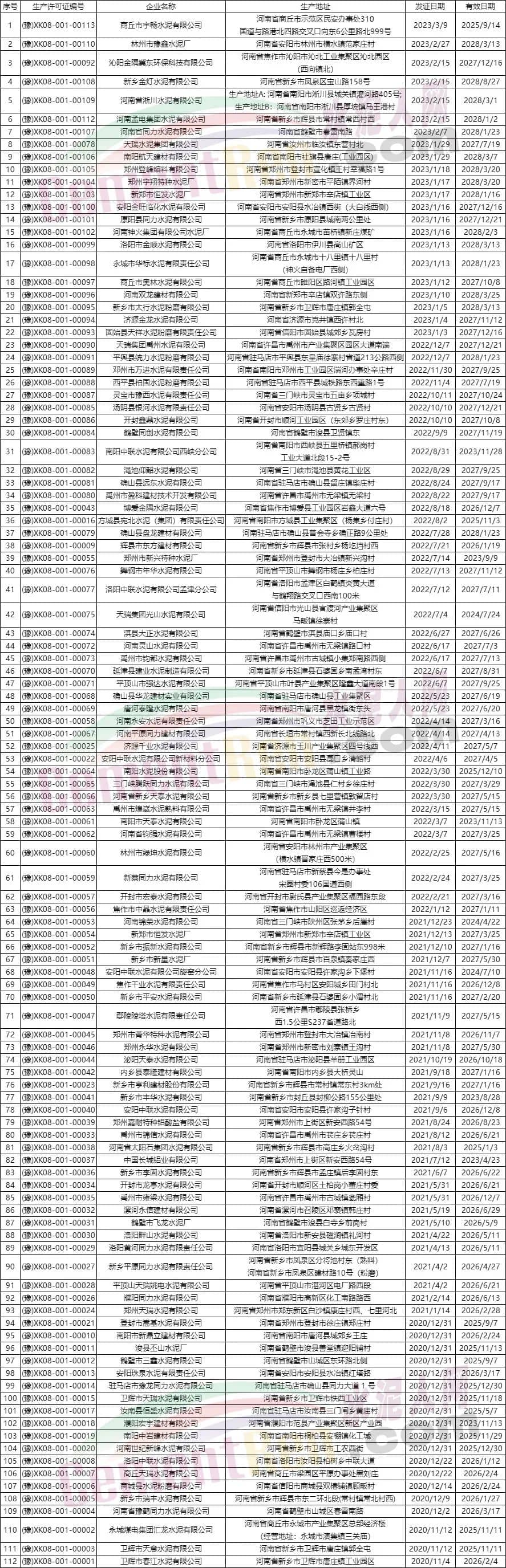 河南省210個編號水泥產品工業(yè)品生產許可證有效