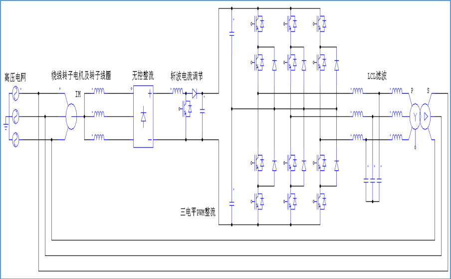 通過在電動(dòng)機(jī)轉(zhuǎn)子回路中串入轉(zhuǎn)子能饋調(diào)速系統(tǒng)來控制轉(zhuǎn)子電流,實(shí)現(xiàn)定、轉(zhuǎn)子之間電磁轉(zhuǎn)矩的調(diào)節(jié),從而達(dá)到調(diào)節(jié)電動(dòng)機(jī)輸出轉(zhuǎn)速的目的。由于轉(zhuǎn)速差而產(chǎn)生的轉(zhuǎn)子回路轉(zhuǎn)差功率又經(jīng)轉(zhuǎn)子能饋調(diào)速裝置反饋回電網(wǎng)再利用,從而達(dá)到調(diào)速和高效節(jié)能的目的。