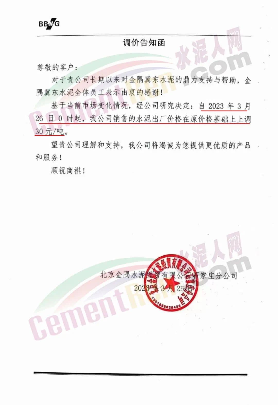 北京金隅水泥石家莊分公司通知,基于當前市場變化情況,經公司研究決定,自2023年3月26日0時起,公司銷售的水泥出廠價格在原價格基礎上上調30元/噸。