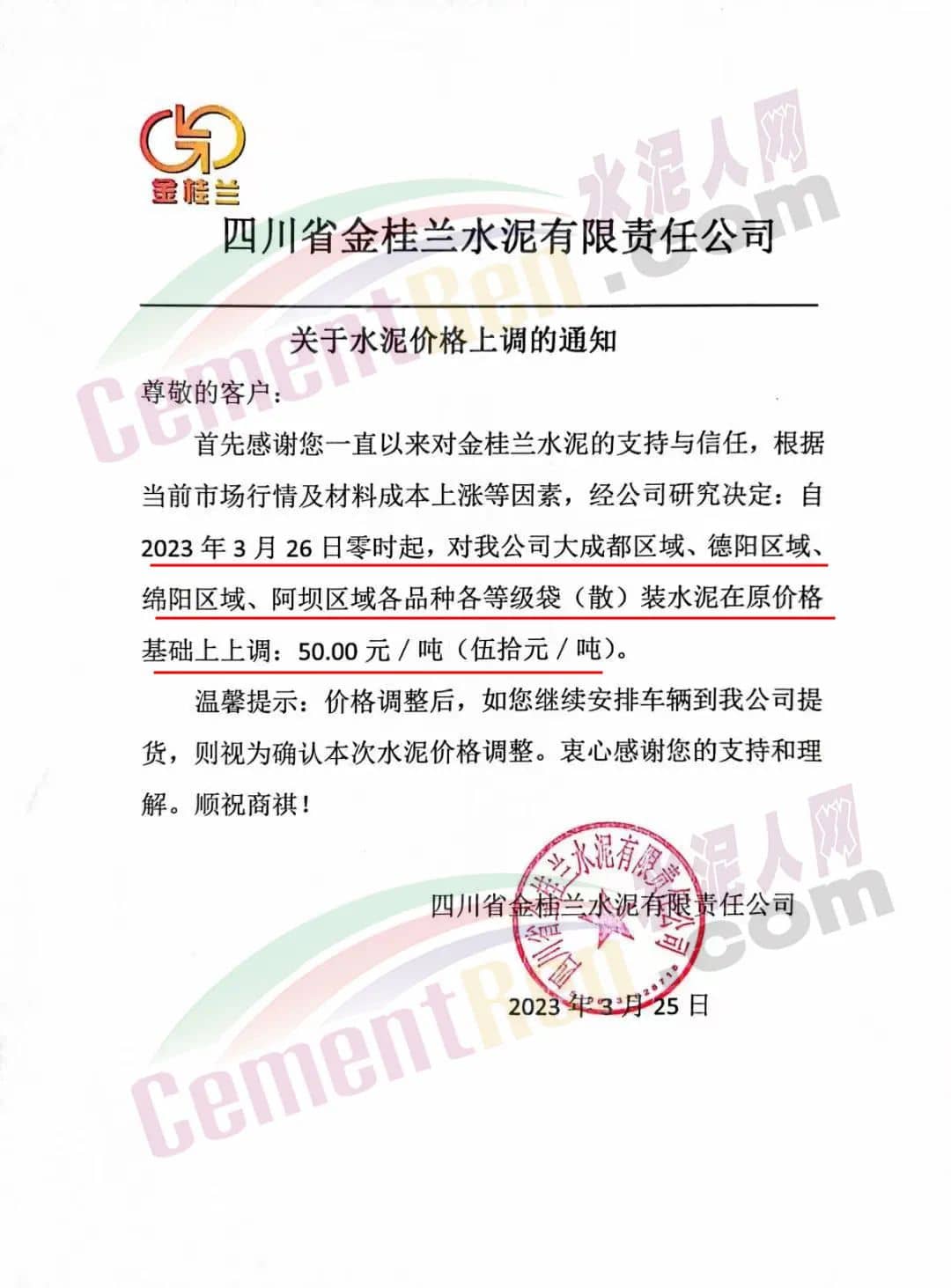 四川省金桂蘭水泥有限責任公司通知,根據當前市場行情及材料成本上漲等因素,經公司研究決定,自2023年3月26日零時起,對公司大成都區(qū)域、德陽區(qū)域綿陽區(qū)域、阿壩區(qū)域各品種各等級袋(散)裝水泥在原價格基礎上上調50元/噸。