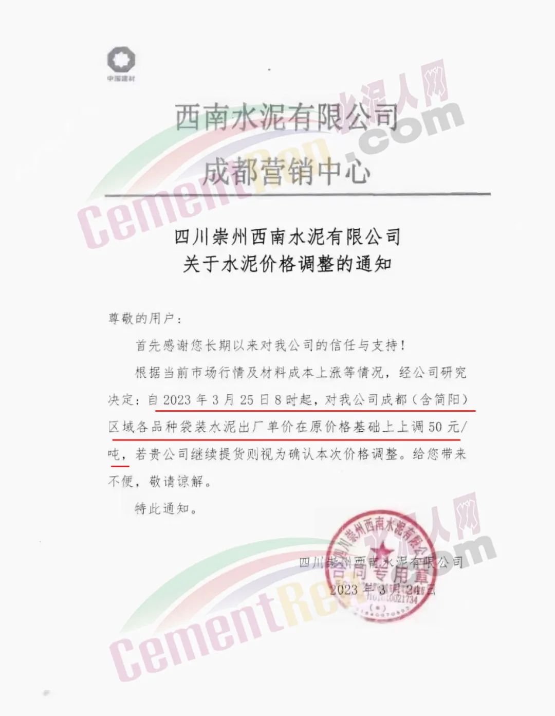 四川崇州西南水泥通知,根據當前市場行情及材料成本上漲等情況,經公司研究決定,自2023年3月25日8時起,對公司成都(含簡陽)區(qū)域各品種袋裝水泥出廠單價在原價格基礎上上調50元/噸。